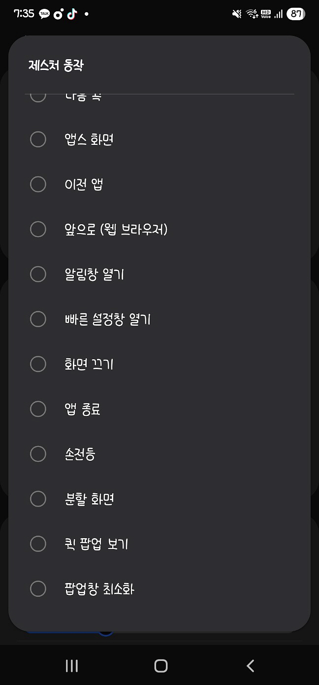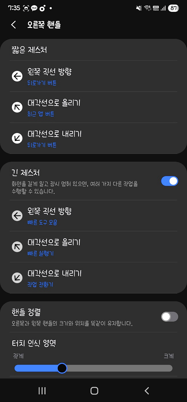 - 대각선 위 또는 아래 → 앱 바로가기 등 지정