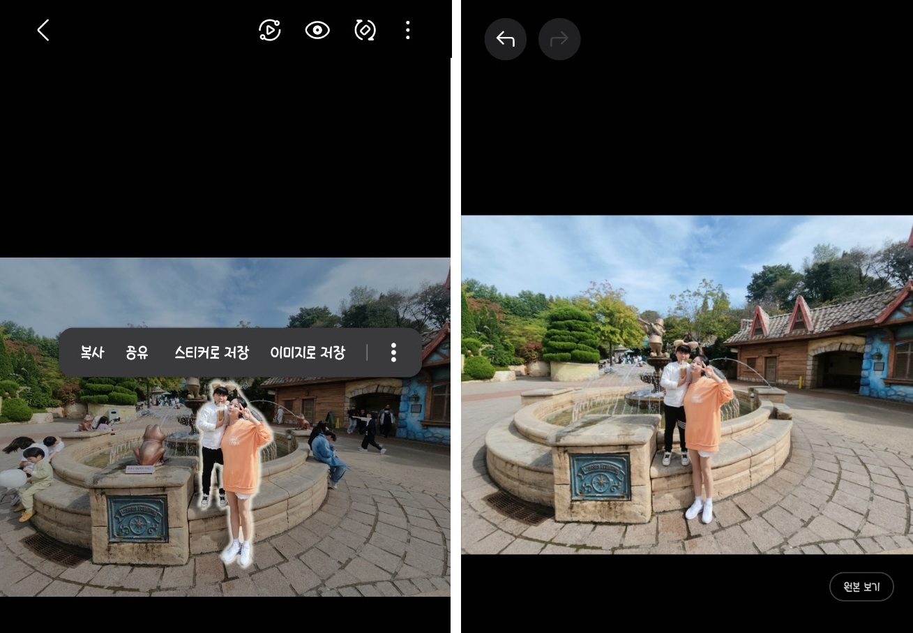 실제로 아이와 놀이동산에서 사진을 찍었을 때 배경에 원치 않는 행인들이 찍혔는데, 포토 어시스트 기능을 사용하니 정말 자연스럽게 사라졌고, 혼자서 걷는 사진도 허전해서 강아지 그림을 그렸더니 이미지 생성이 되어서 더 예쁘더라구요.